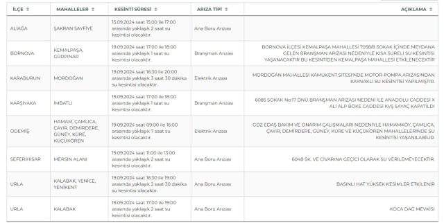 İzmir’de su kesinti yaşanacak ilçe ve mahalleler kesinti süresi ile nedenlerine göre şu şekildedir: