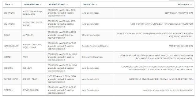 İzmir’de su kesinti yaşanacak ilçe ve mahalleler kesinti süresi ile nedenlerine göre şu şekildedir: