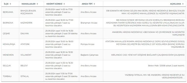 İzmir’de su kesinti yaşanacak ilçe ve mahalleler kesinti süresi ile nedenlerine göre şu şekildedir: