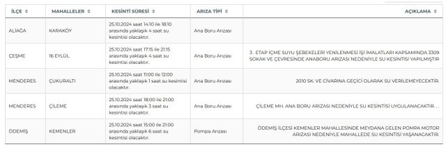 İzmir’de su kesinti yaşanacak ilçe ve mahalleler kesinti süresi ile nedenlerine göre şu şekildedir: