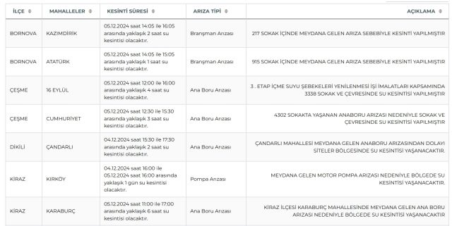 İzmir’de su kesinti yaşanacak ilçe ve mahalleler kesinti süresi ile nedenlerine göre şu şekildedir: