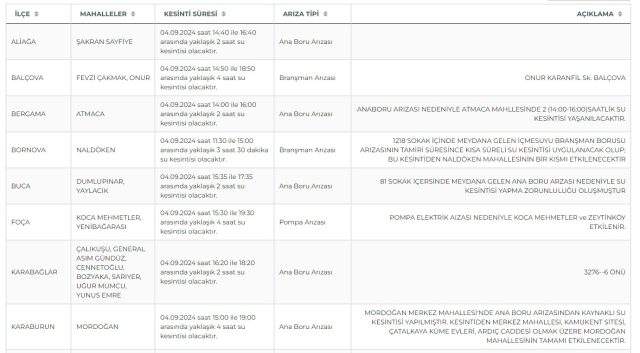 İzmir’de su kesinti yaşanacak ilçe ve mahalleler kesinti süresi ile nedenlerine göre şu şekildedir:
