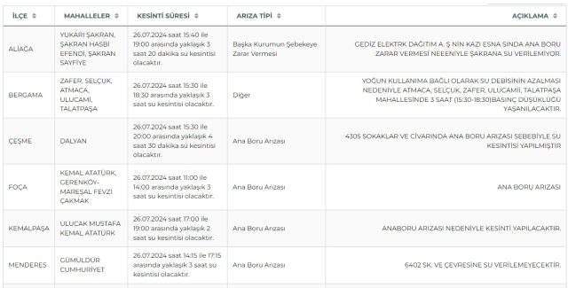 İzmir’de su kesinti yaşanacak ilçe ve mahalleler kesinti süresi ile nedenlerine göre şu şekildedir: