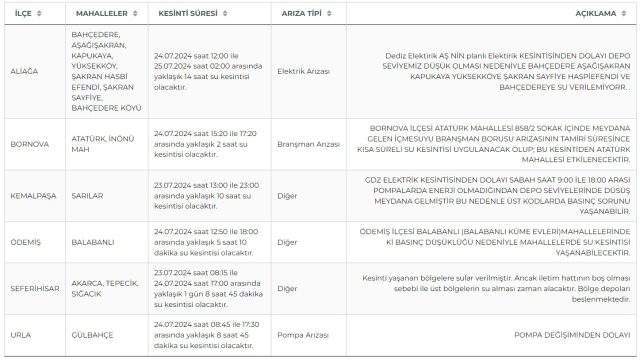 İzmir’de su kesinti yaşanacak ilçe ve mahalleler kesinti süresi ile nedenlerine göre şu şekildedir: