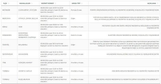 İzmir’de su kesinti yaşanacak ilçe ve mahalleler kesinti süresi ile nedenlerine göre şu şekildedir: