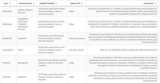 İzmir’de su kesinti yaşanacak ilçe ve mahalleler kesinti süresi ile nedenlerine göre şu şekildedir: