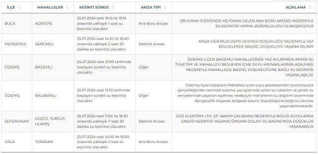 İzmir’de su kesinti yaşanacak ilçe ve mahalleler kesinti süresi ile nedenlerine göre şu şekildedir: