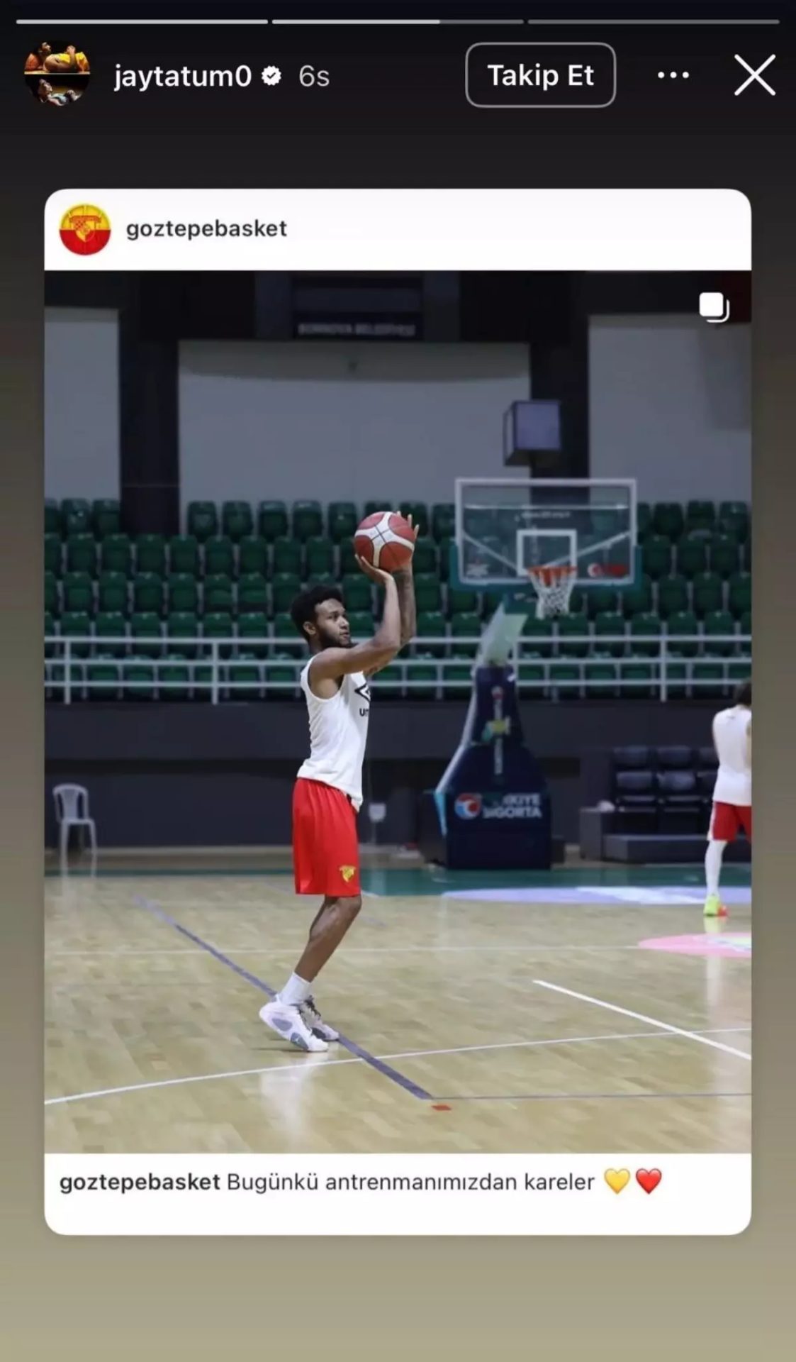 NBA’de Boston Celtics formayı giyen dünyaca ünlü basketbolcu Jayson Tatum, sosyal medya hesabından Göztepe’nin gönderisini paylaştı. Türkiye Basketbol Ligi’ndeki İzmir ekibinin bu sene kadrosuna kattığı Jordan Barnes’ı antrenman yaparken yaptığı paylaşımı Tatum da 7,3 milyon takipçili sosyal medya hesabından yayınladı. Barnes’ın Tatum ile lise takımından arkadaş oldukları öğrenildi. Temmuz ayında Göztepe’ye imza atan 27 yaşındaki guard Barnes geçen sezon da ülkemizde forma giymişti.