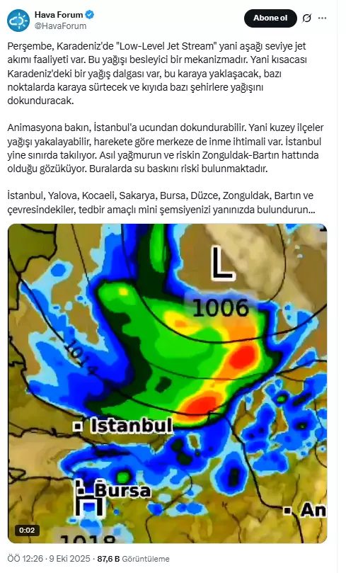 Açıklamanın devamın ise, “Perşembe, Karadeniz’de “Low-Level Jet Stream” yani aşağı seviye jet akımı faaliyeti var. Bu yağışı besleyici bir mekanizmadır. Yani kısacası Karadeniz’deki bir yağış dalgası var, bu karaya yaklaşacak, bazı noktalarda karaya sürtecek ve kıyıda bazı şehirlere yağışını dokunduracak. Animasyona bakın, İstanbul’a ucundan dokundurabilir. Yani kuzey ilçeler yağışı yakalayabilir, harekete göre merkeze de inme ihtimali var. İstanbul yine sınırda takılıyor. Asıl yağmurun ve riskin Zonguldak- Bartın hattında olduğu gözüküyor. Buralarda su baskını riski bulunmaktadır. denildi.