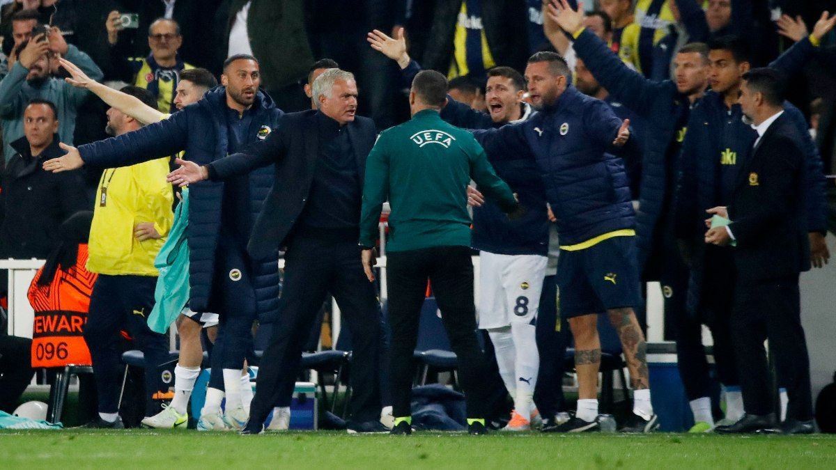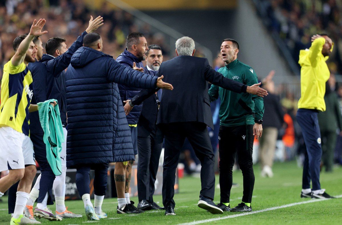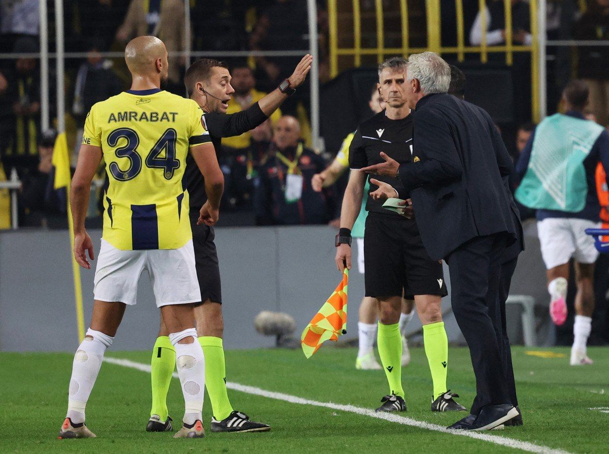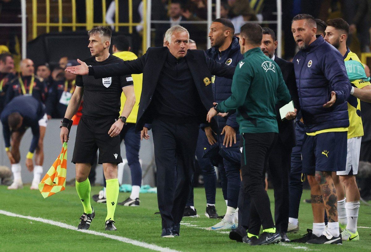 Hakem Turpin, itirazların ardından 59. dakikada Fenerbahçe Teknik Direktörü Jose Mourinho’ya kırmızı kart gösterdi.