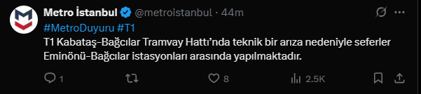 T1 Kabataş-Bağcılar tramvay hattında yaşanan teknik arıza sebebiyle seferlerin Eminönü-Bağcılar istasyonları arasında yapıldığı kaydedildi. Metro İstanbul tarafından sosyal medyadan yapılan açıklamada, “T1 Kabataş-Bağcılar Tramvay Hattı’nda teknik bir arıza nedeniyle seferler Eminönü-Bağcılar istasyonları arasında yapılmaktadır” ifadelerine yer verildi.