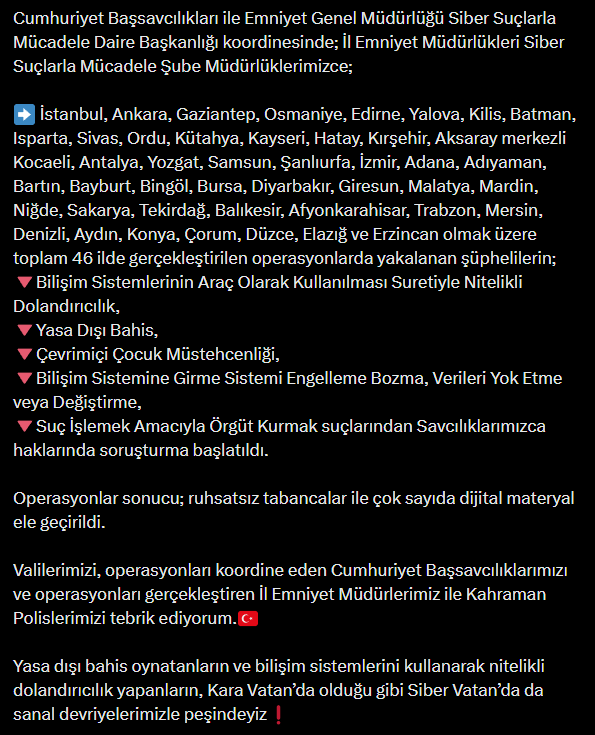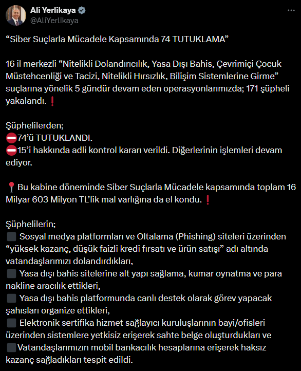İçişleri Bakanı Ali Yerlikaya sosyal medya hesabından yaptığı paylaşımda 16 ilde siber suçlar kapsamında operasyon yapıldığını ve toplamda 171 şüphelinin yakalandığını, bunlardan da 74’ünün tutuklandığını açıkladı. Yakalanan şüphelilerin;