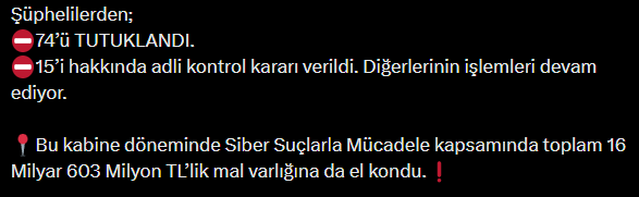 - Bu kabine döneminde Siber Suçlarla Mücadele kapsamında toplam 16 Milyar 603 Milyon TL’lik mal varlığına da el kondu