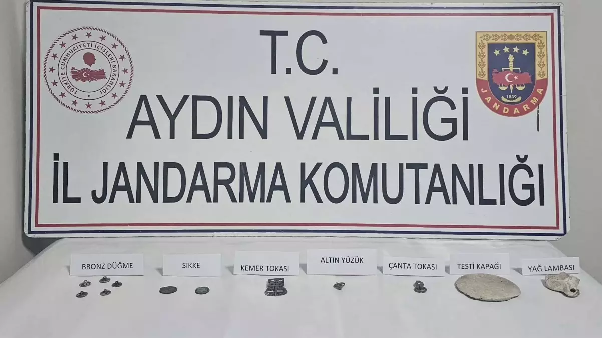 Bozdoğan İlçe Jandarma Komutanlığı’na bağlı ekipler, kırsal Akyaka Mahallesi’nde E.Ö.’ye ait arazide kaçak kazı yapan kişilerin buldukları Roma ve Bizans dönemlerine ait olduğu değerlendirilen tarihi eserleri satmak için müşteri aradığı bilgisine ulaştı. E.Ö.’yü takibe alan ekipler, E.Ö.’nün S.Ö., E.Ö. ve E.İ. ile müşteri aradığını tespit etti. Şüphelilere yönelik dün operasyon düzenledi. 4 şüpheli gözaltına alınırken, yapılan aramalarda 2 bronz sikke, altın yüzük, 5 bronz düğme, gümüş kemer tokası, gümüş çanta tokası, yağ lambası, testi kapağı olmak üzere 12 parça ele geçirildi. Tarihi eser olduğu değerlendirilen parçalar incelenmek üzere Aydın Arkeoloji Müze Müdürlüğü’ne teslim edildi.