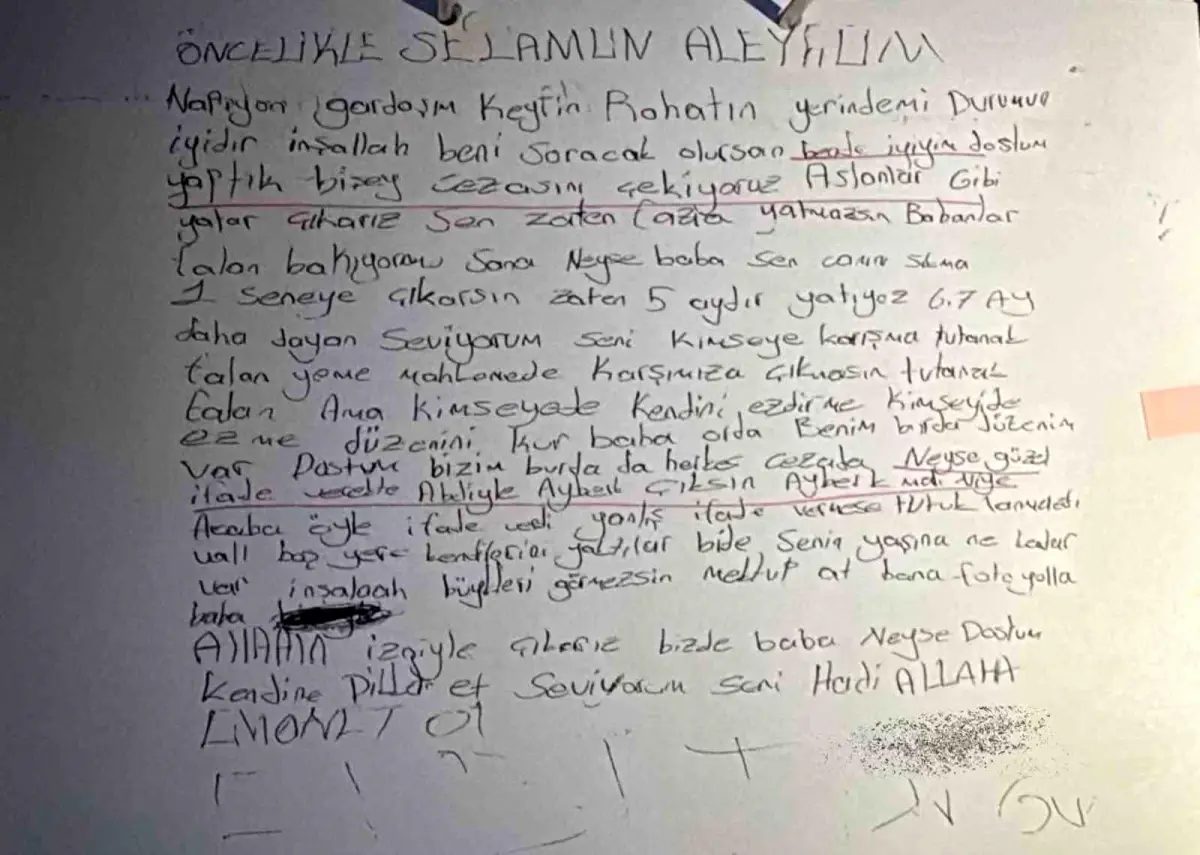 Sanık B.B. tarafından gönderilen mektupta, “Napıyon gardaşım, keyfin rahatın yerinde mi? Durumun iyidir inşallah. Beni soracak olursan iyiyim, yaptık bir şey cezasını çekiyoruz. Aslanlar gibi yatar çıkarız. Sen zaten fazla yatmazsın. Babanlar sana bakıyor mu? Neyse baba sen canını sıkma, 1 seneye çıkarsın. Zaten 5 aydır yatıyoruz. 6-7 ay daha dayan. Seviyorum seni. Kimseye karışma, tutanak yeme. Mahkemede karşımıza çıkmasın. Kimseye kendini ezdirme. Kimseyi de ezme. Kendi düzenini kur, benim burada düzenim var. Neyse güzel ifade verelim de Abdi’yle Ayberk çıksın. Ayberk yanlış ifade vermese tutuklanmazdı. Boş yere kendilerini yaktılar. Bana fotoğraf yolla. Allah’ın izniyle çıkarız. Kendine dikkat et, seviyorum seni” ifadeleri yer aldı.