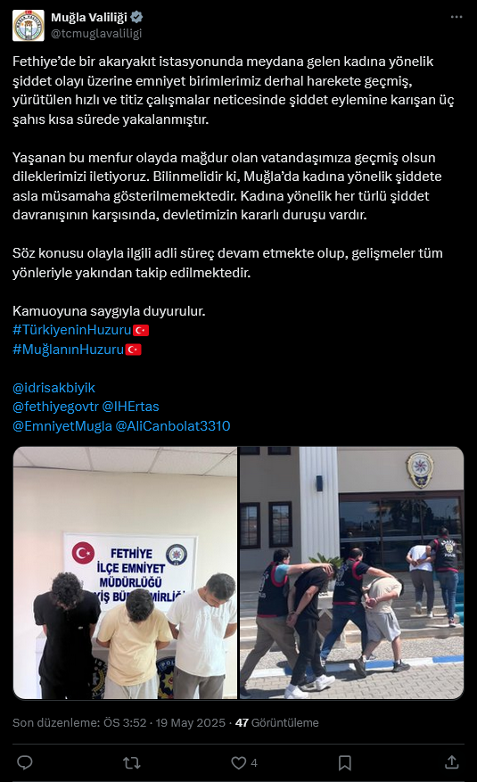 Fethiye’de bir akaryakıt istasyonunda meydana gelen kadına yönelik şiddet olayı üzerine emniyet birimlerimiz derhal harekete geçmiş, yürütülen hızlı ve titiz çalışmalar neticesinde şiddet eylemine karışan üç şahıs kısa sürede yakalanmıştır.