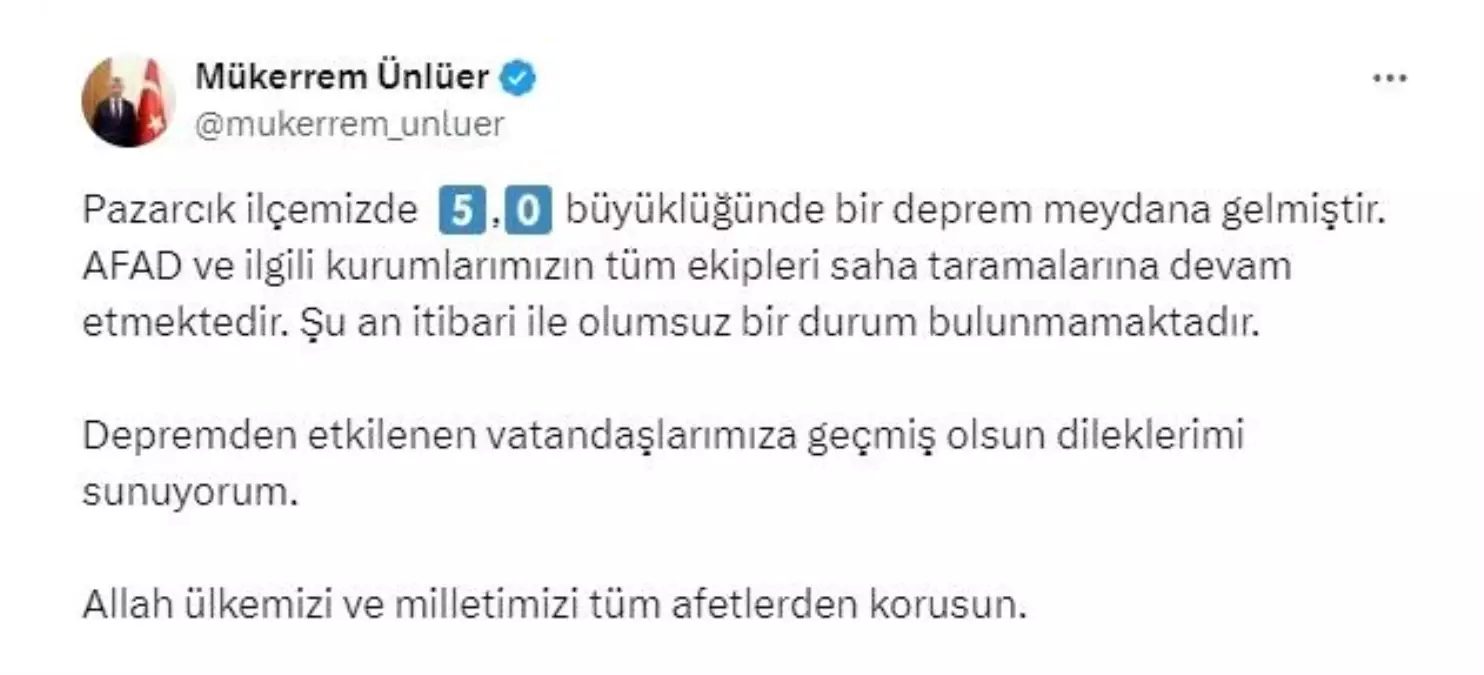 Kahramanmaraş Valisi Mükerrem Ünlüer, meydana gelen 5.0 büyüklüğündeki deprem sonrası AFAD ve ilgili kurumların tüm ekipleri ile saha taramalarına devam ettiği ve şu an itibari ile olumsuz bir durum bulunmadığını açıkladı.