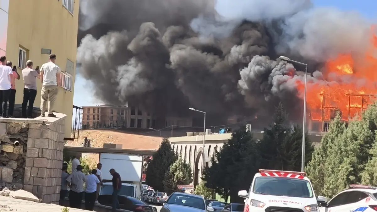 Kahramanmaraş'ta inşaat halindeki lojmanda yangın çıktı, itfaiye havadan ve karadan müdahale ediyor.