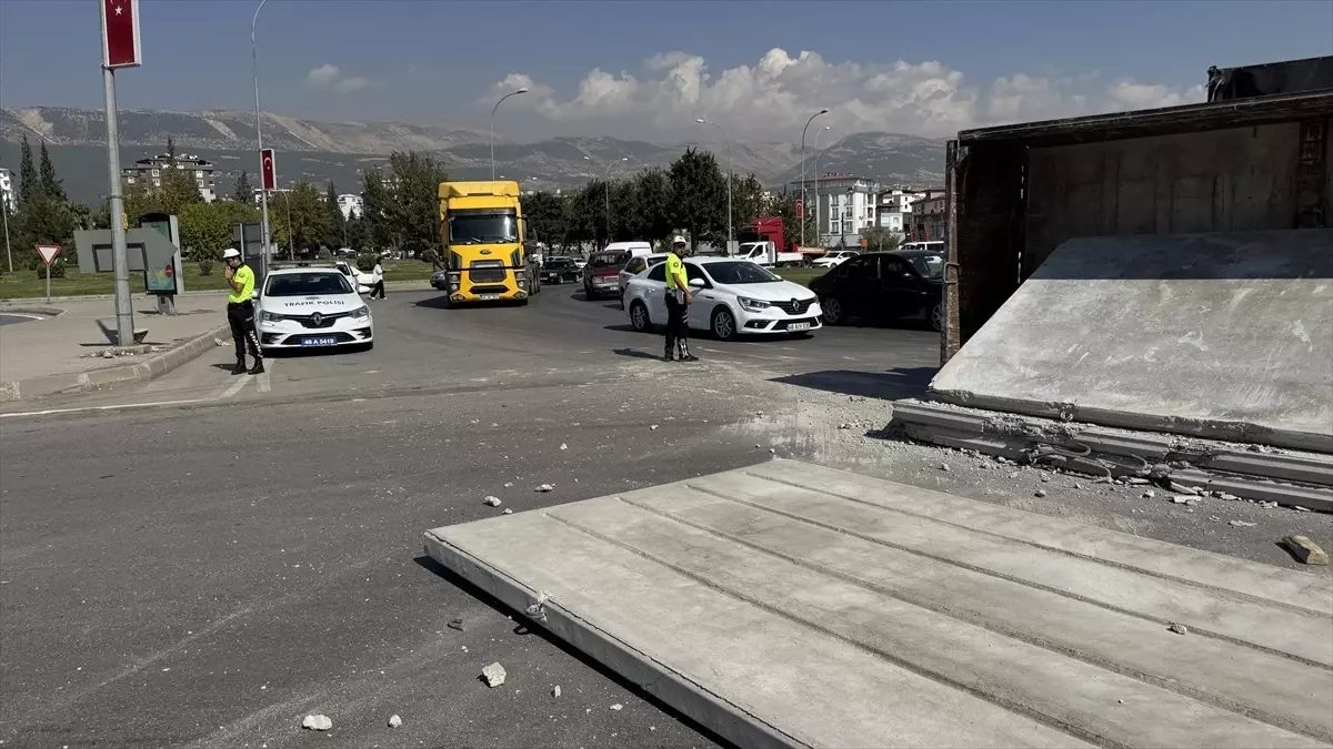 Kahramanmaraş’ın Dulkadiroğlu ilçesinde beton blok yüklü tır devrildi.