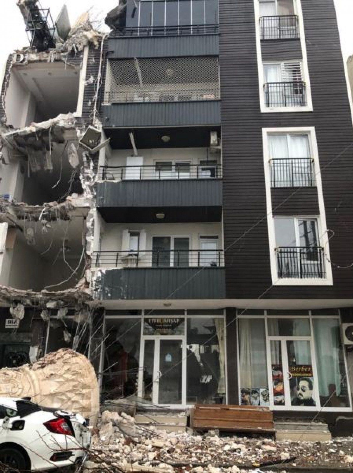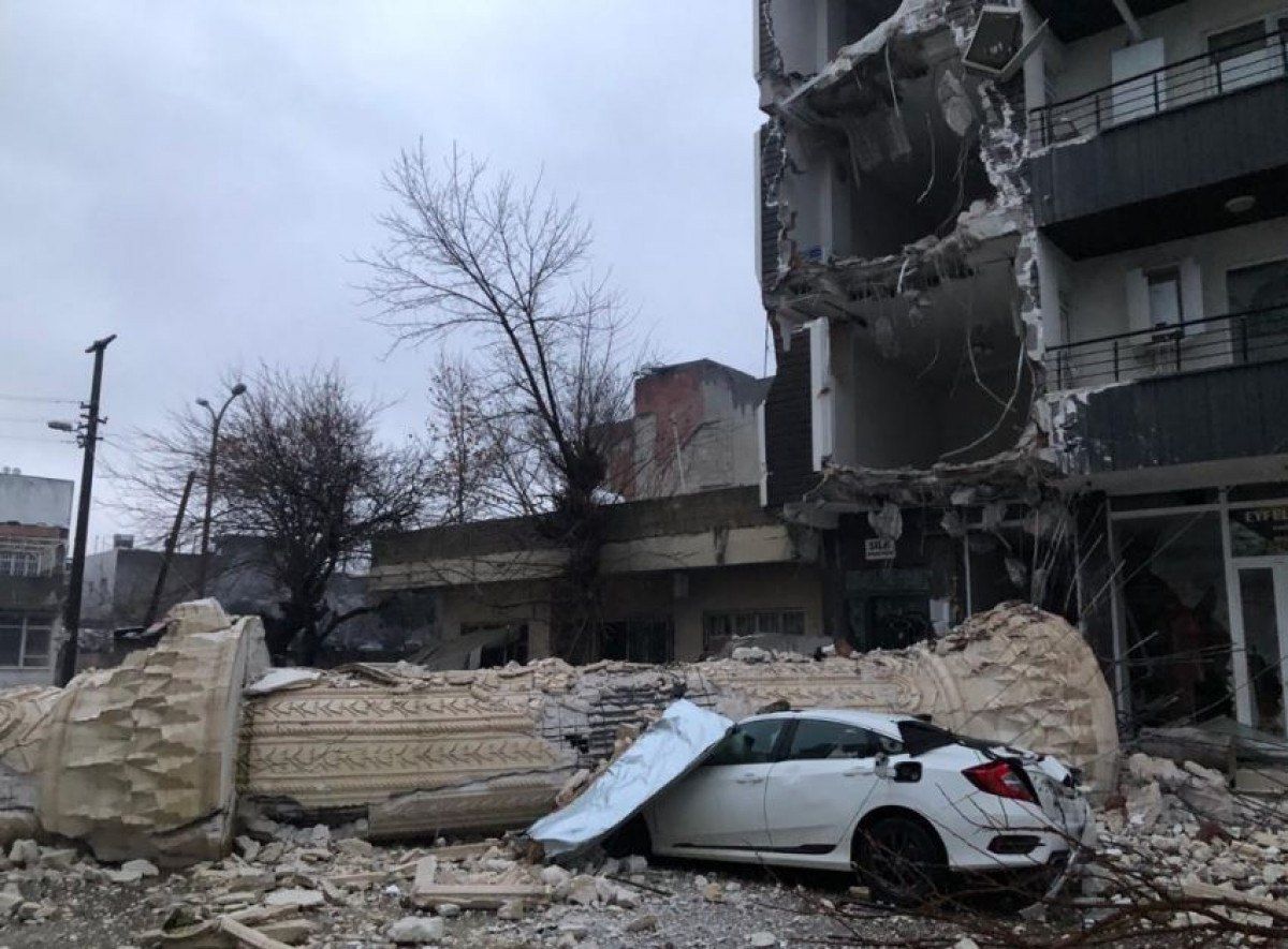 Kahramanmaraş merkezli depremlerde Adıyaman Hastane Camisi’nin minaresi, yanındaki 4 katlı binanın üzerine devrildi.