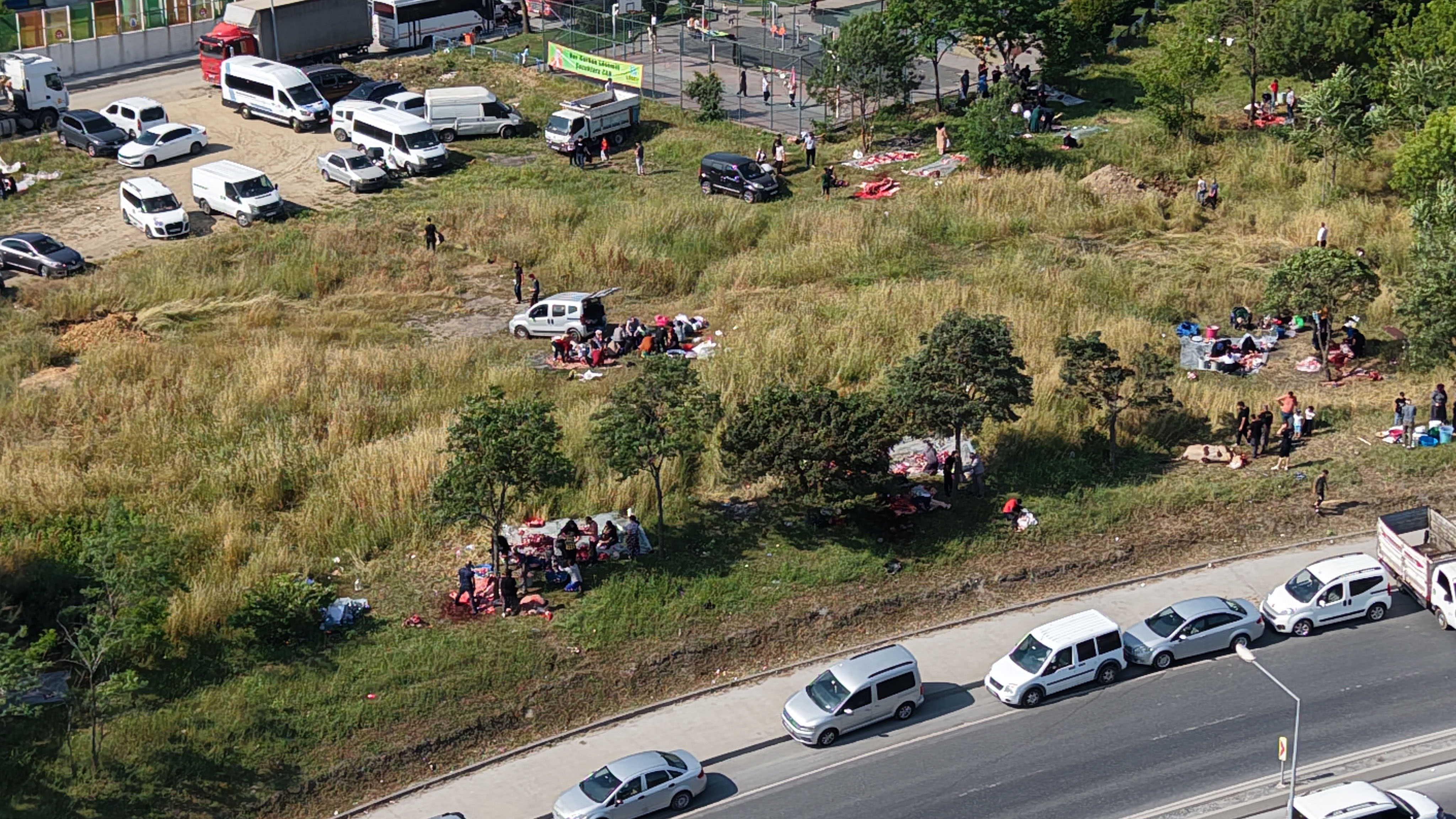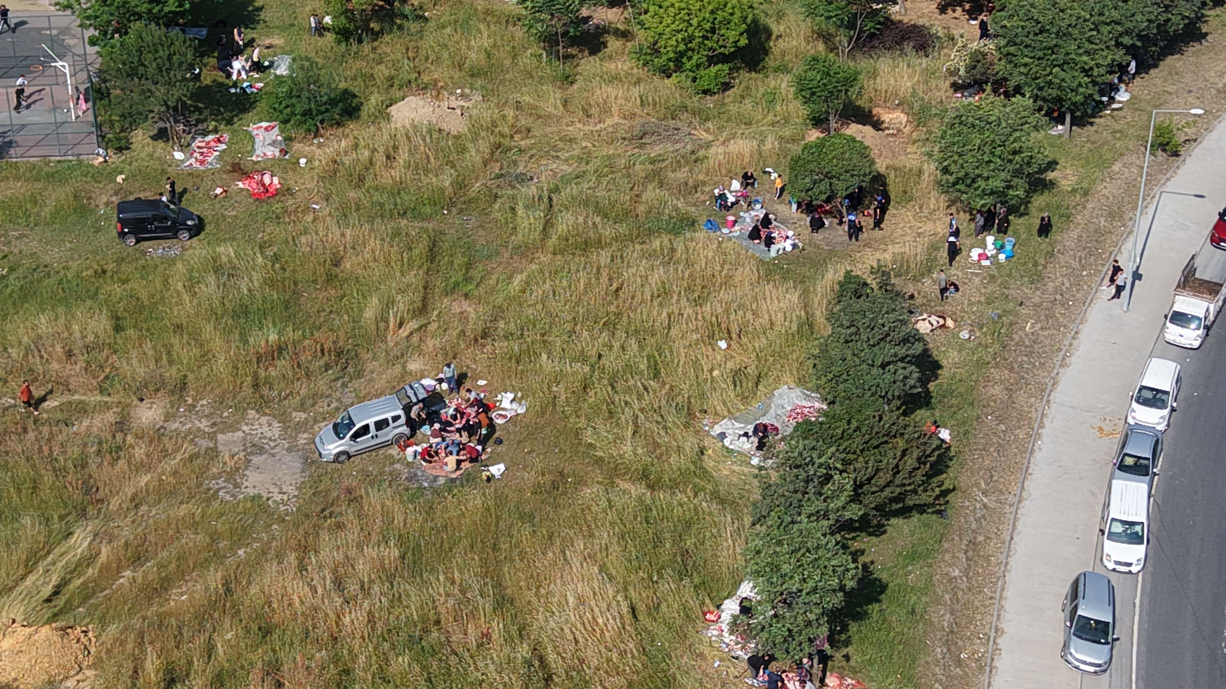 İlçedeki kurban satış alanına birkaç kilometre uzaklıkta bulunan boş arazide, mide bulandıran görüntüler drone ile de kaydedildi.