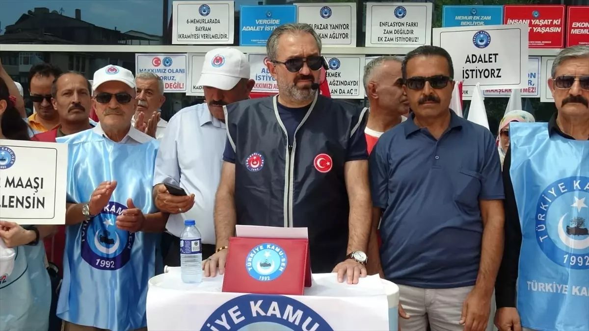 Pankart ve dövizlerle Karabük Eğitim ve Araştırma Hastanesi önünde bir araya gelen sendika üyeleri adına konuşan Kamu-Sen İl Temsilcisi Sadık Doğdu, memur ve emekli maaşlarına zam istekilerini söyledi.