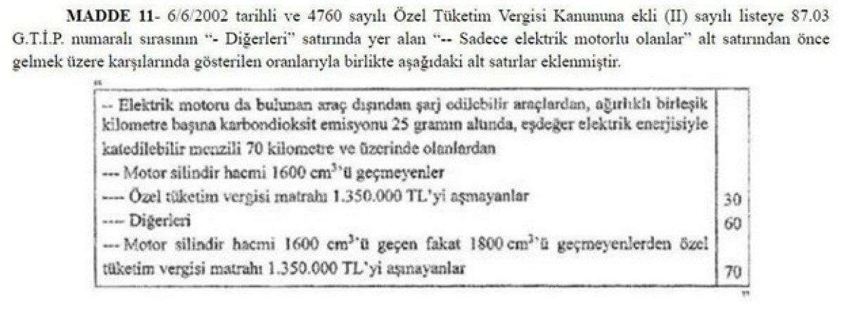 Araç dışından şarj edilebilen 70 kilometrenin üzerinde menzile sahip hibrit araçlara Özel Tüketim Vergisi teşviği sağlanacak.