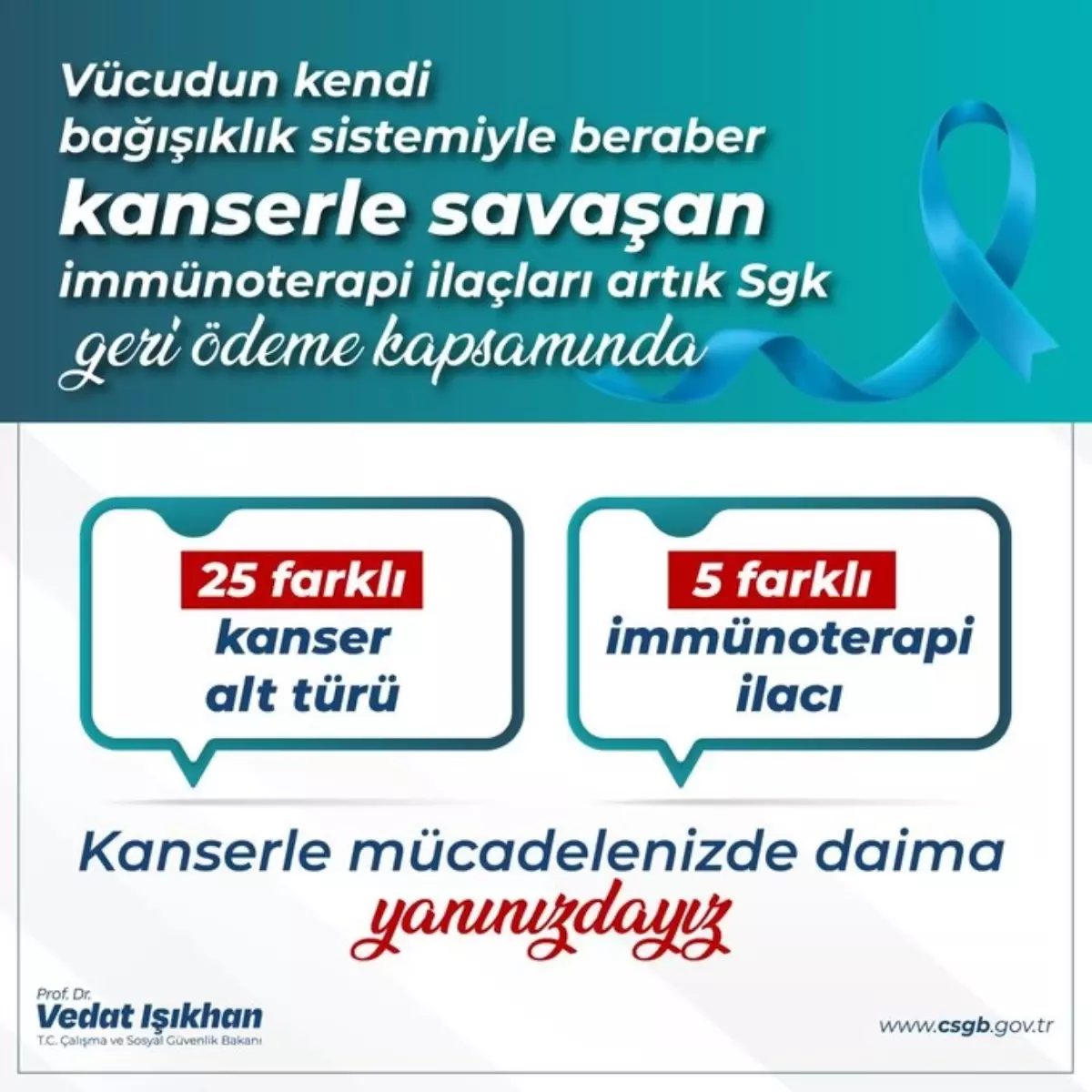 Bakan Işıkhan, sosyal medya hesabından yaptığı açıklamada, “Cumhurbaşkanımız Sayın Recep Tayyip Erdoğan’ın Cumhurbaşkanlığı Kabine Toplantımızın ardından açıkladığı müjdeyle kanserle mücadele eden vatandaşlarımıza önemli bir destek sağlayacağız. Vücudun kendi bağışıklık sistemiyle beraber 25 farklı kanser alt türüne karşı uygulanan 5 immünoterapi ilacını Sosyal Güvenlik Kurumumuzun geri ödeme kapsamına alıyoruz. Yapılacak düzenlemeyle 48 bin kanser hastası bu tedavilerden faydalanacak. Düzenlemeyle birlikte geri ödeme listesindeki kanser ilacı sayısı 784’e yükselmiş olacak. Kanserle savaşan vatandaşlarımızın mücadelelerinde yanlarında olmaya devam edeceğiz. İlaçların hastalarımıza şifa olmasını temenni ediyorum” ifadelerini kullandı.