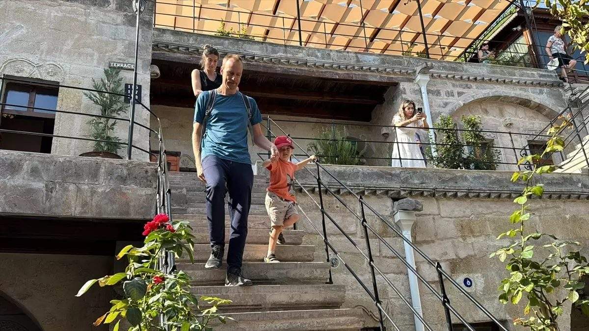Tatil için Nevşehir’in Göreme beldesine gelen Richard Dearden, peribacaları ve doğal kaya oluşumlarını yakından görmek için ailesiyle vadi yürüyüşüne çıktı.