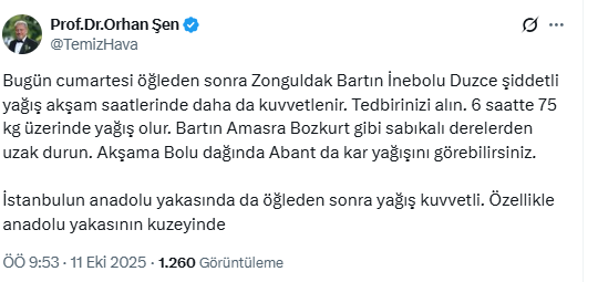 “Bugün cumartesi öğleden sonra Zonguldak, Bartın, İnebolu, Düzce şiddetli yağış akşam saatlerinde daha da kuvvetlenir. Tedbirinizi alın. 6 saatte 75 kg üzerinde yağış olur. Bartın, Amasra, Bozkurt gibi sabıkalı derelerden uzak durun. Akşama Bolu dağında Abant da kar yağışını görebilirsiniz. İstanbul’un Anadolu yakasında da öğleden sonra yağış kuvvetli. Özellikle Anadolu yakasının kuzeyinde”