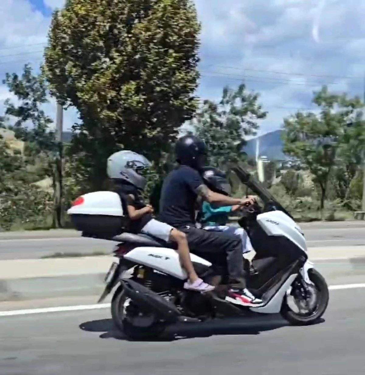 Karabük'te 2'si çocuk 3 kişinin motosiklet üzerindeki tehlikeli yolculuğu bir sürücü tarafından cep telefonu kamerasıyla kaydedildi.