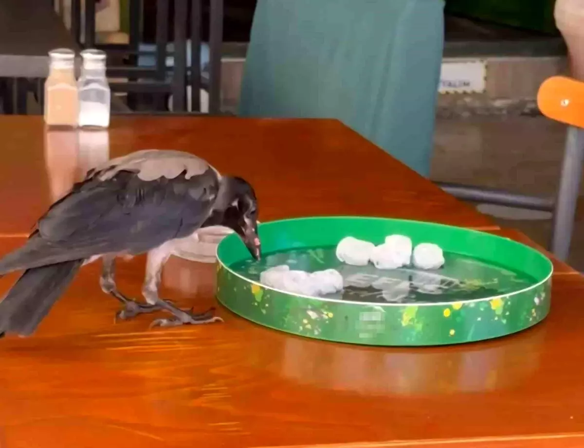 Muğla’nın Bodrum ilçesinde sıcak havadan bunalan bir karga, soluğu kafelerde aldı. Geleneksel çarşıda bir kafeteryaya konan karga, hem serinledi hem de karnını doyurdu.