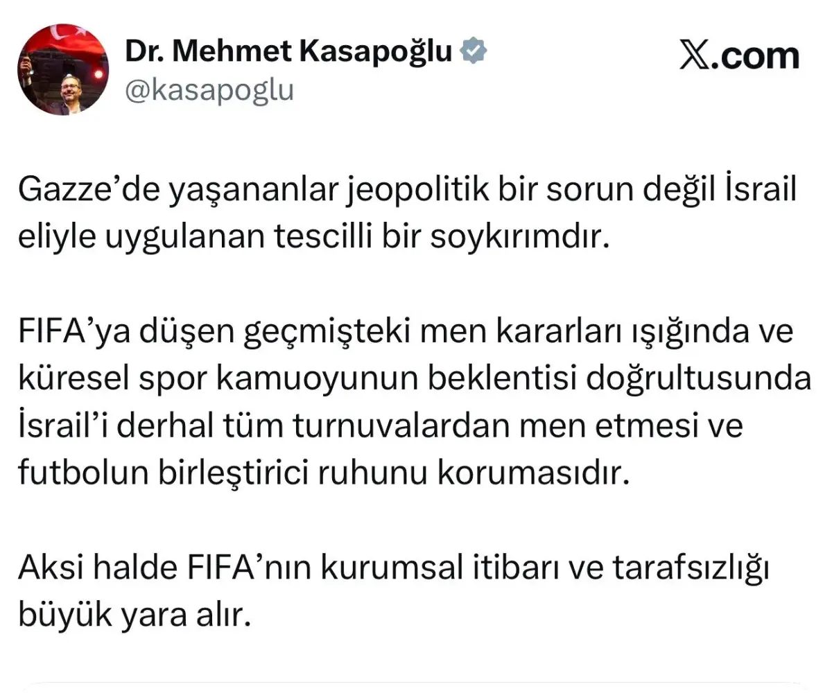 Önceki dönem Gençlik ve Spor Bakanı, AK Parti İzmir Milletvekili Dr. Mehmet Kasapoğlu, FIFA Başkanı Gianni Infantino’nun Gazze soykırımı nedeniyle İsrail’in uluslararası müsabakalardan men edilmesi yönündeki taleplere karşılık “Futbolun jeopolitik sorunları çözemeyeceği” şeklindeki sözlerine, geçmiş yıllarda alınan kararları da örnek vererek tepki gösterdi.