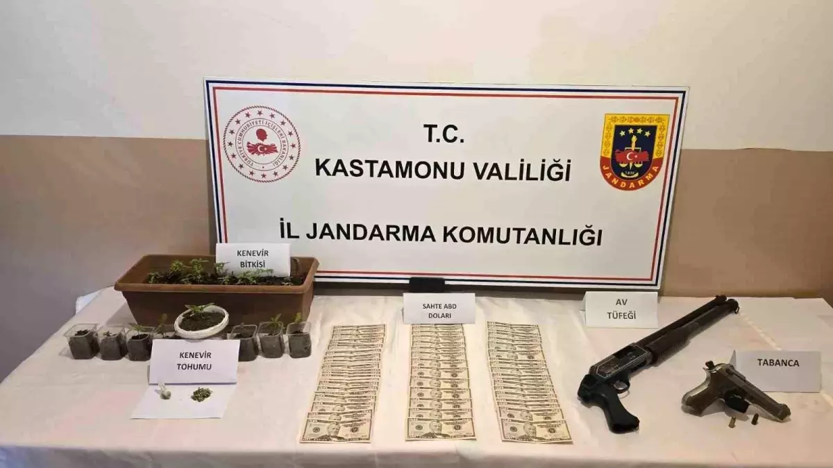Edinilen bilgiye göre, Kastamonu İl Jandarma Komutanlığı ekiplerince uyuşturucu madde imal ve ticareti yapan şahıslara yönelik yürütülen çalışmalar neticesinde, tespiti yapılan H.A. isimli şahsın Cide ilçesindeki evinde arama yapıldı. Aramada bir miktar kenevir bitkisi ve 75 adet sahte ABD doları ve 2 adet silah ele geçirildi.