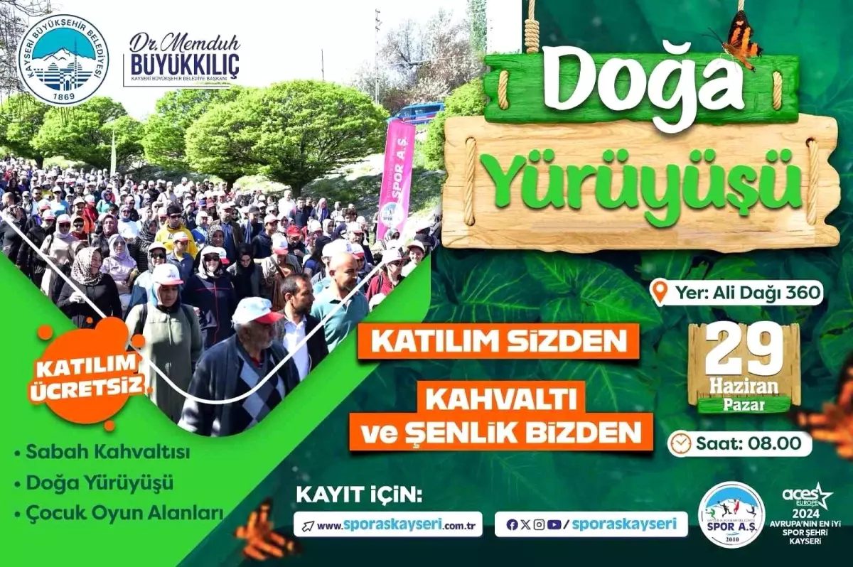Hayata geçirdiği proje ve gerçekleştirdiği yatırımlarla Avrupa Spor Şehri seçilen Kayseri’ye Altın Bayrak kazandıran Başkan Dr. Memduh Büyükkılıç yönetimindeki Kayseri Büyükşehir Belediyesi, insanı merkezine alan faaliyetlere imza atmayı sürdürüyor. Sporun ve sporcunu dostu Büyükşehir Belediyesi, bu kez de vatandaşları keyif dolu bir aktiviteye çağırıyor. Ali Dağı 360’tan 29 Haziran Pazar günü saat 08.00’de başlayacak katılımın ücretsiz olduğu doğa yürüyüşü, sporu, eğlenceyi ve sosyal etkinliği bir arada sunacak. Sabahın ilk ışıkları ile başlayacak coşku dolu etkinlikte, sabah kahvaltısı, doğa yürüyüşü ve çocuk oyun alanları yer alacak. Katılımın vatandaşlardan, kahvaltı ve şenliğin Büyükşehir Belediyesi’nden olacağı doğa yürüyüşüne kayıtlar yalnızca online olarak yapılırken, kayıt için www.sporaskayseri.com.tr adresli web sitesi ziyaret edilecek.