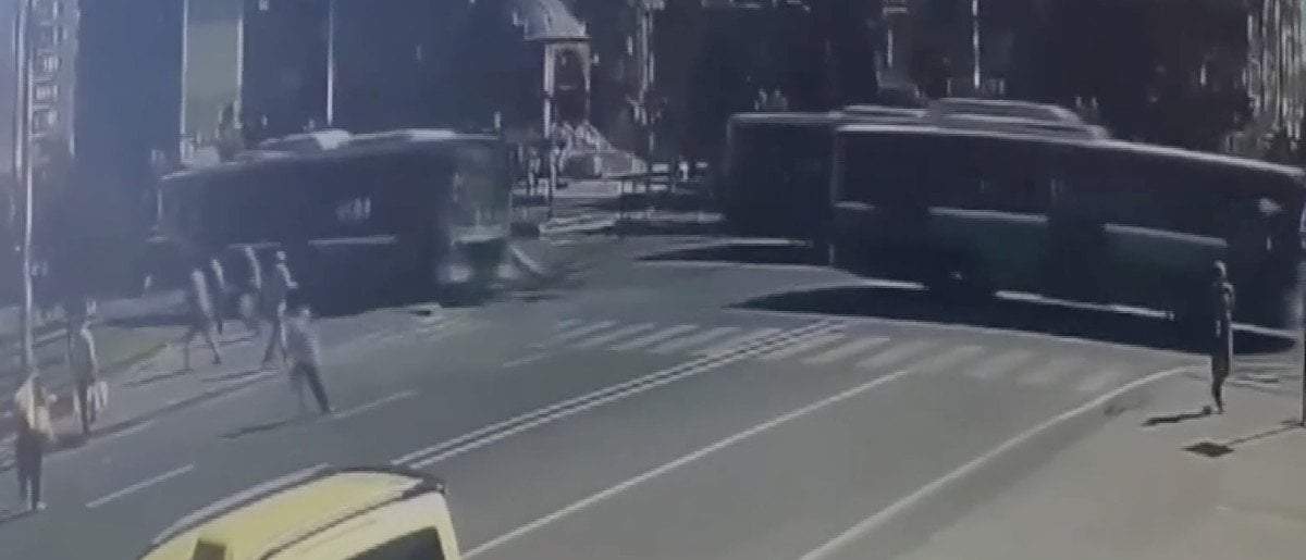 Görüntülerde kaldırımda yürüyen bir kişinin son anda otobüsün altında kalmaktan kurtulduğu görüldü.