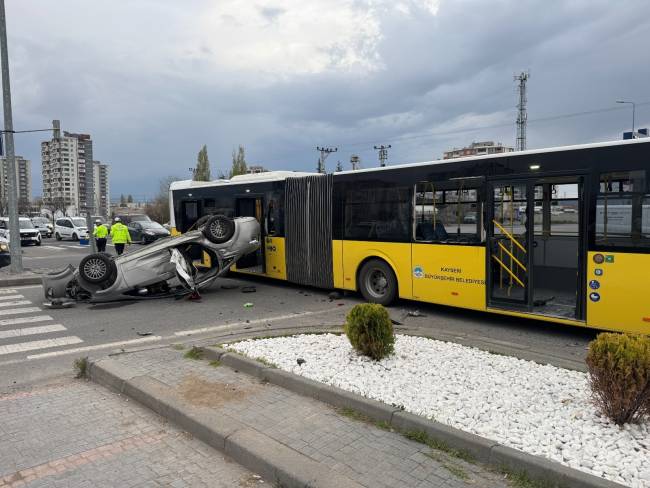 Kayseri’de özel halk otobüsü ile bir otobüsün çarpıştığı feci kazada otomobil ters döndü.