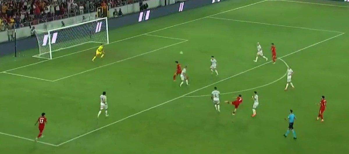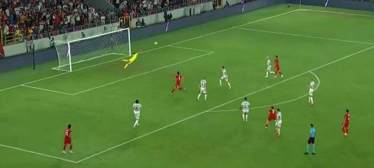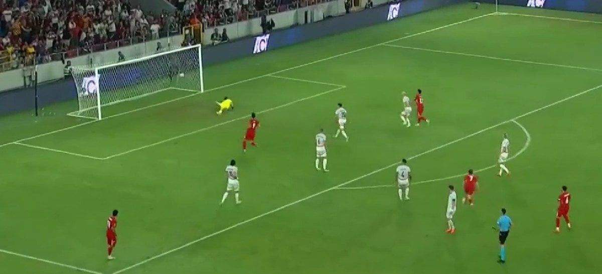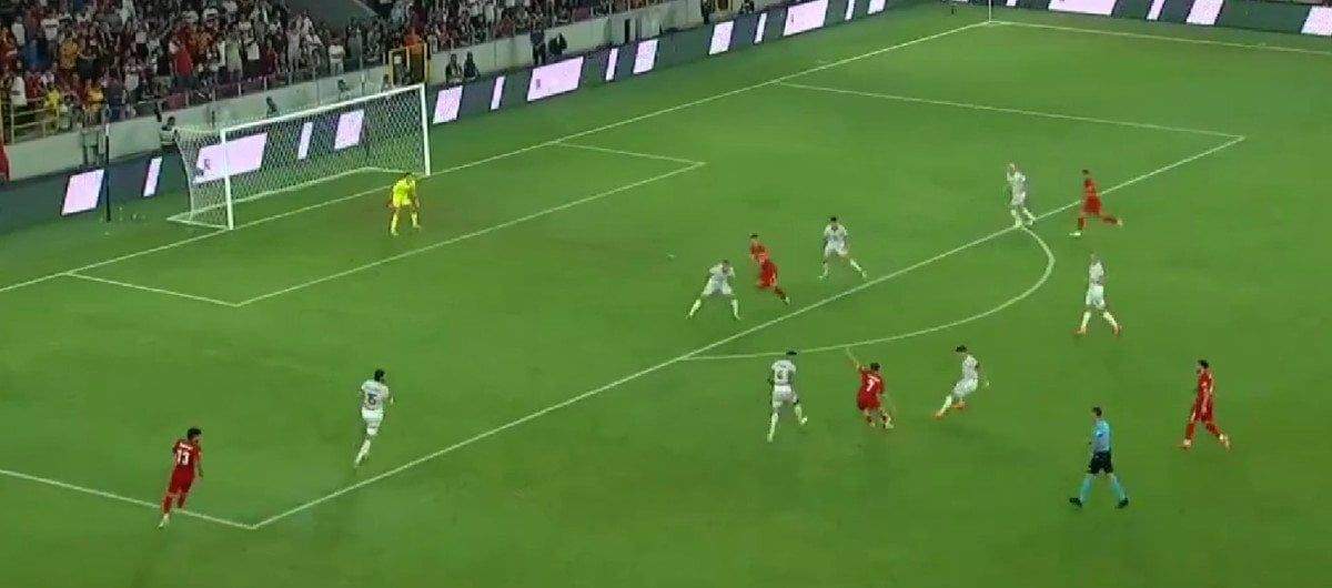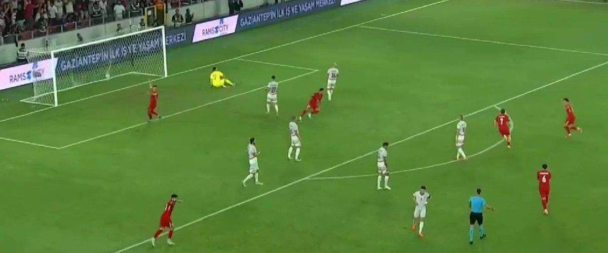 Eren Elmalı’nın pasıyla ceza sahası dışı sol çaprazında topla buluşan Kerem Aktürkoğlu sağ ayağıyla vuruşunu yaptı, meşin yuvarlak uzak köşeden ağlarla buluştu.