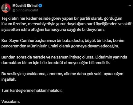 Söz konusu kararın ardından Birinci, partisinden istifa ettiğini duyurdu. Birinci, sosyal medya hesabından yaptığı açıklamada şu ifadelere yer verdi: “Teşkilatın her kademesinde görev yapan bir partili olarak, gördüğüm lüzum üzerine, mensubiyetiyle gurur duyduğum parti üyeliğimden ve aktif siyasetten istifa ettiğimi kamuoyuna saygı ile bildiriyorum. Ben Sayın Cumhurbaşkanımızı bir baba dostu, büyük bir Lider, benim penceremden Müminlerin Emini olarak görmeye devam edeceğim. Bundan sonra da nerede ve ne zaman ihtiyaç olursa, Liderimin yanında durmaktan bir an için bile tereddüt etmeyeceğim bilinmelidir. Bu vesileyle çocuklarıma, anneme, aileme daha çok vakit ayıracağım inşallah. Tüm kardeşlerime hakkım helaldir. Vesselam.”