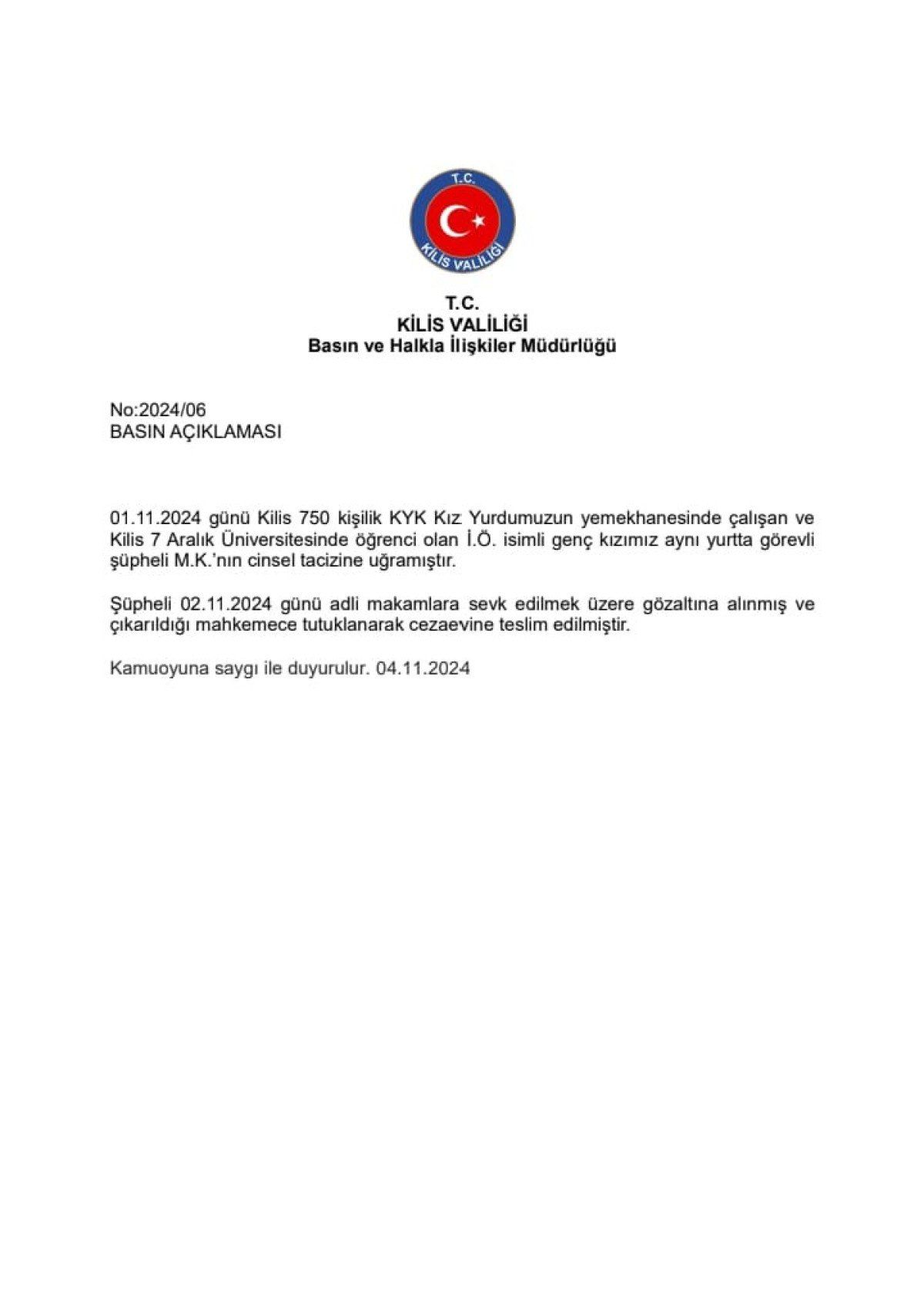 01.11.2024 tarihinde, Kilis 750 kişilik KYK Kız Yurdu’nda yemekhanede çalışan ve Kilis 7 Aralık Üniversitesi öğrencisi olan İ.Ö., yurtta görevli şüpheli M.K.’nın cinsel tacizine uğramıştır. Şüpheli, 02.11.2024 tarihinde adli makamlara sevk edilmek üzere gözaltına alınmış ve mahkeme tarafından tutuklanarak cezaevine gönderilmiştir