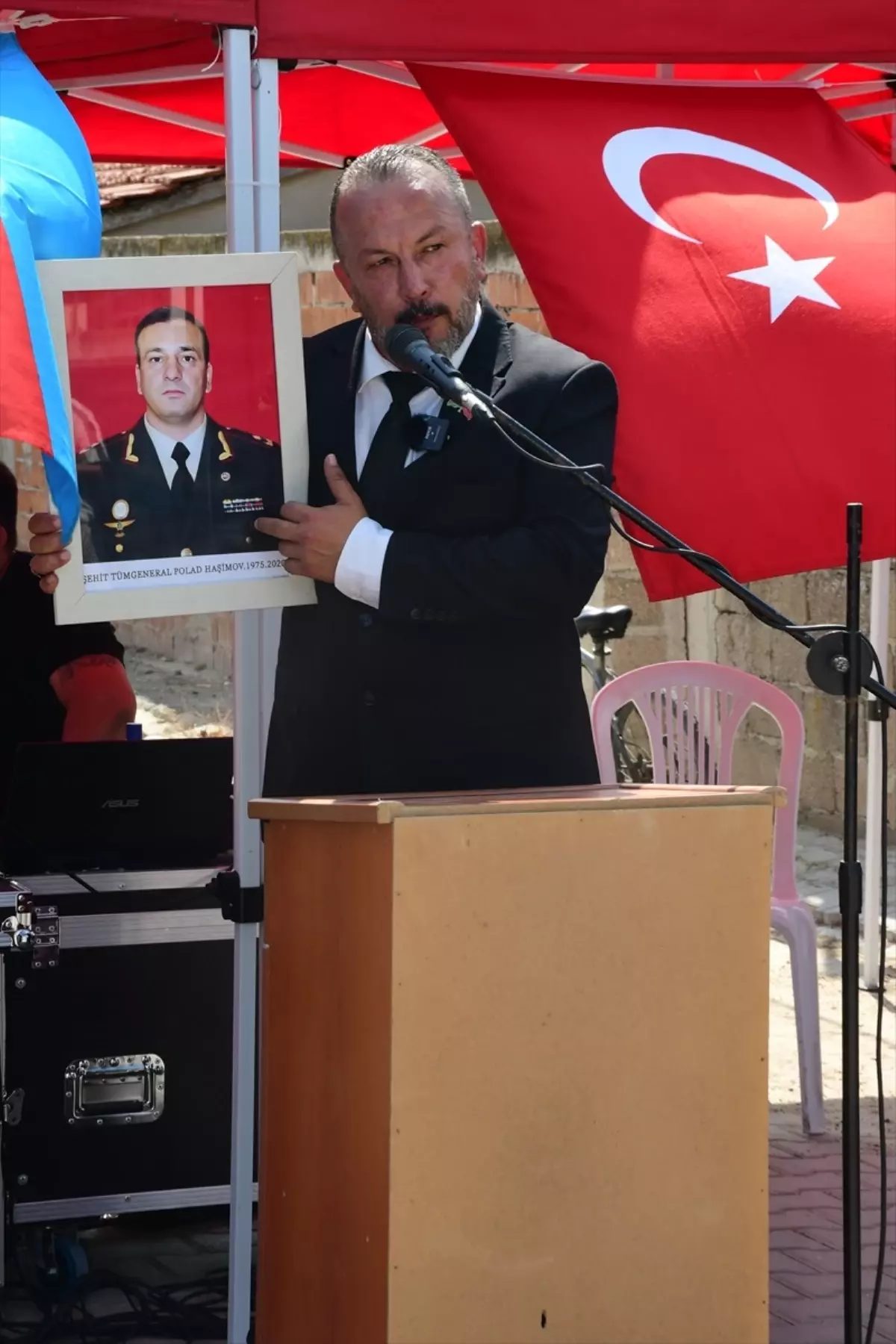 Etkinliğe katılan eski Azerbaycan Cumhurbaşkanı Ebulfez Elçibey’in damadı Agil Sametbeyli, Evrensekiz Belediye Başkanı Birol Özbay ile Tunçkol, Azerbaycan ve Türk bayraklarını göndere çekti.