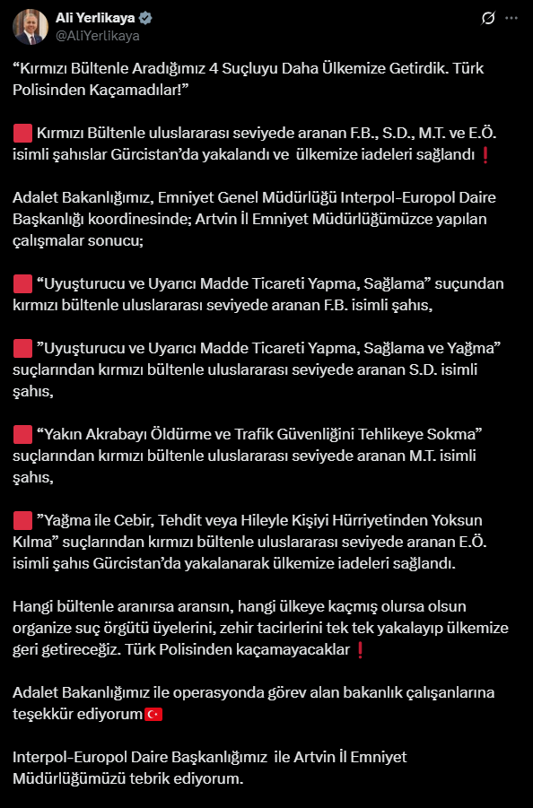 Yerlikaya, açıklamasında “Adalet Bakanlığımız, Emniyet Genel Müdürlüğü Interpol-Europol Daire Başkanlığı koordinesinde; Artvin İl Emniyet Müdürlüğümüzce yapılan çalışmalar sonucu; “Uyuşturucu ve Uyarıcı Madde Ticareti Yapma, Sağlama” suçundan kırmızı bültenle uluslararası seviyede aranan F.B. isimli şahıs, ”Uyuşturucu ve Uyarıcı Madde Ticareti Yapma, Sağlama ve Yağma” suçlarından kırmızı bültenle uluslararası seviyede aranan S.D. isimli şahıs, “Yakın Akrabayı Öldürme ve Trafik Güvenliğini Tehlikeye Sokma” suçlarından kırmızı bültenle uluslararası seviyede aranan M.T. isimli şahıs, ”Yağma ile Cebir, Tehdit veya Hileyle Kişiyi Hürriyetinden Yoksun Kılma” suçlarından kırmızı bültenle uluslararası seviyede aranan E.Ö. isimli şahıs Gürcistan’da yakalanarak ülkemize iadeleri sağlandı.” sözlerini sarf etti.