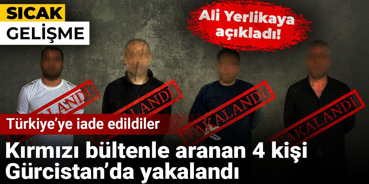 İçişleri Bakanı Ali Yerlikaya, sosyal medya hesabından yaptığı açıklamada, kırmızı bültenle aranan 4 kişinin Gürcistan’da yakalandığını ifade ederek “Kırmızı Bültenle uluslararası seviyede aranan F.B., S.D., M.T. ve E.Ö. isimli şahıslar Gürcistan’da yakalandı ve ülkemize iadeleri sağlandı.” ifadelerini kullandı.