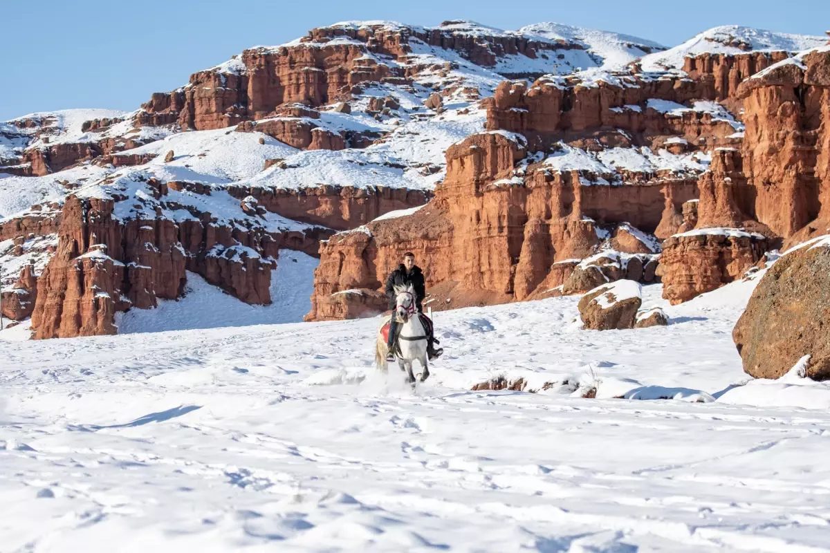 Narman ilçesinde, kırmızı renkli ve farklı şekilleriyle dikkat çeken, yöre insanının ‘Kırmızı Periler Diyarı’ olarak adlandırdığı Narman Peri Bacaları, geçen hafta yağan karın ardından beyaz örtüyle kaplandı. Rüzgar ve su erozyonunun etkisiyle ‘Pliyosen Çağı’ndan bugüne kadar şekillenen, kırmızı kum taşları ve çakıl taşlarının demir minerallerinin zenginleşmesiyle kızıl tonlara bürünen peri bacalarının beyaz örtülü hali, ziyaretçilerin ilgisini çekiyor. Narman- Pasinler kara yolunun 7’nci kilometresinde yer alan, 62 kilometre uzunluğunda 3 vadiden oluşan bölgeyi, yerli ve yabancı turistler ziyaret ediyor. Bölgeye gelenler, peri bacalarını atlı safariyle gezerken, keyifli zaman geçirdiklerini ifade ediyor.