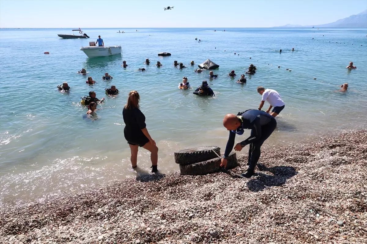 Konyaaltı Varyant Ekdağ 1 No’lu Plajı önünde dalgıçlar su altından plastik, cam ve pet şişeler ile metal parçalar çıkardı. Bu sırada gönüllüler de kıyıdaki çöpleri topladı.