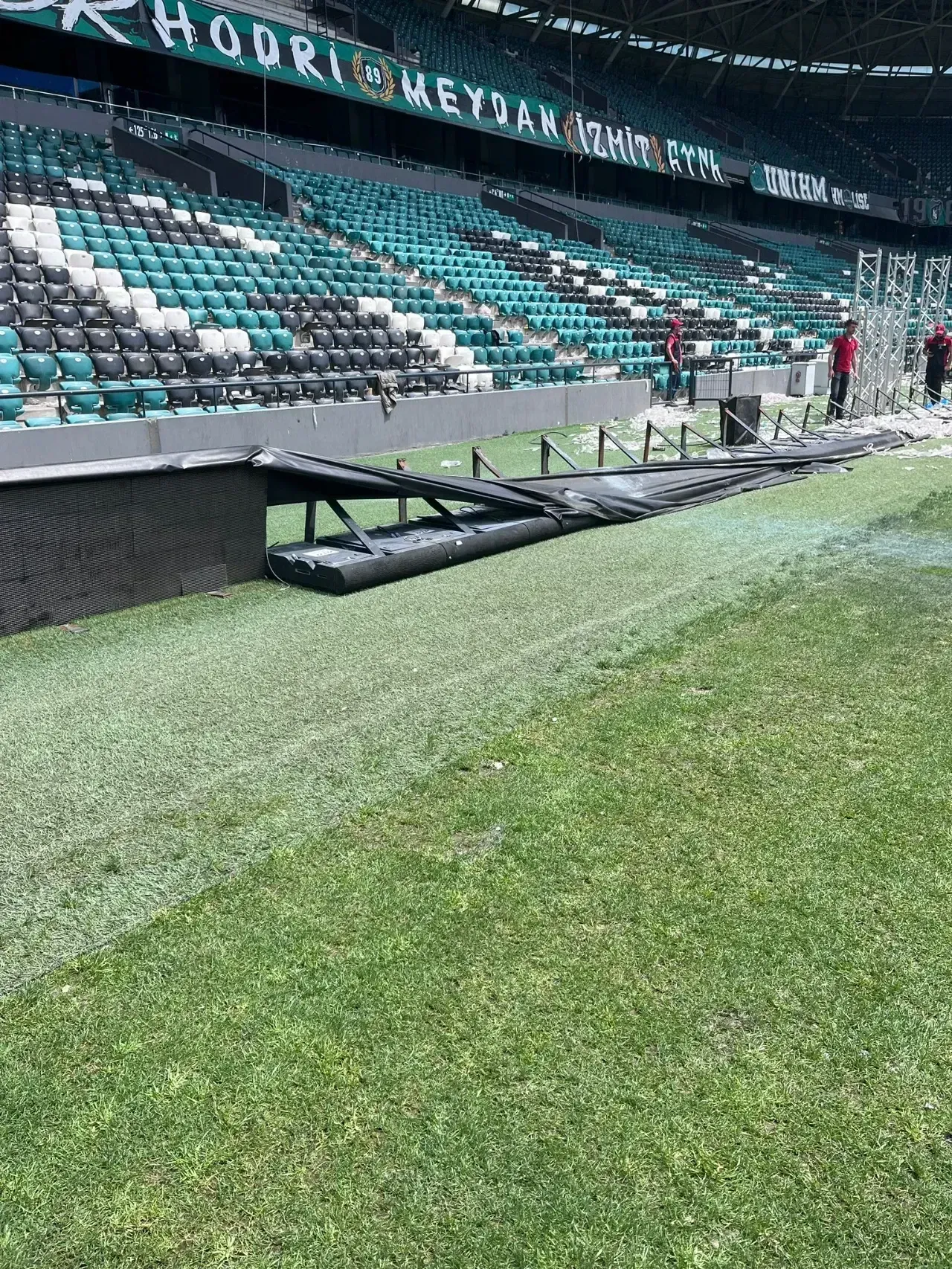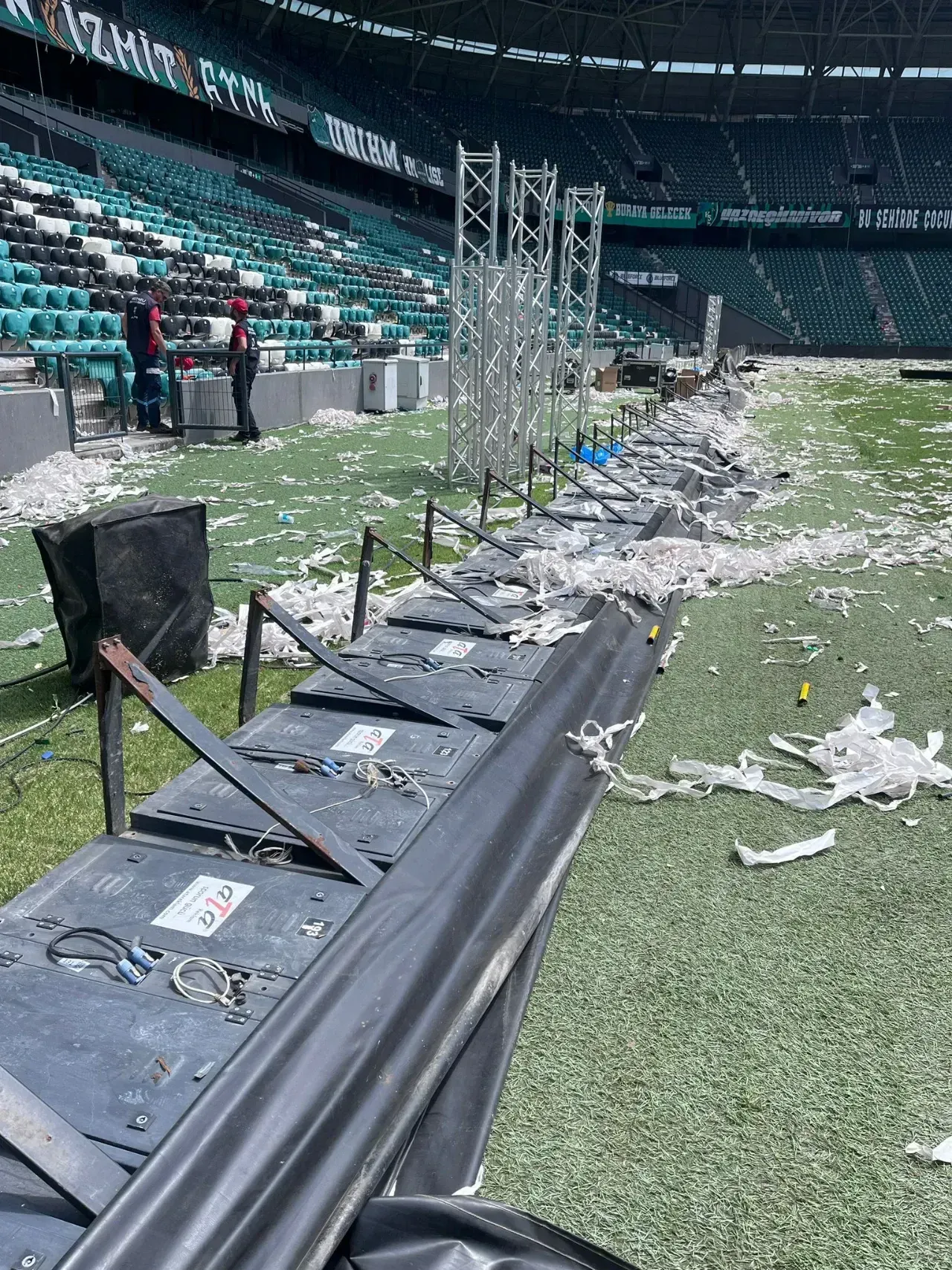 Bunun yanı sıra, saha zemininde yer alan kale direkleri kırıldı, yeşil-siyah renklerdeki özel üretim kale fileleri kesildi ve maraton tribünü önündeki 60 metrelik LED pano hasar gördü.