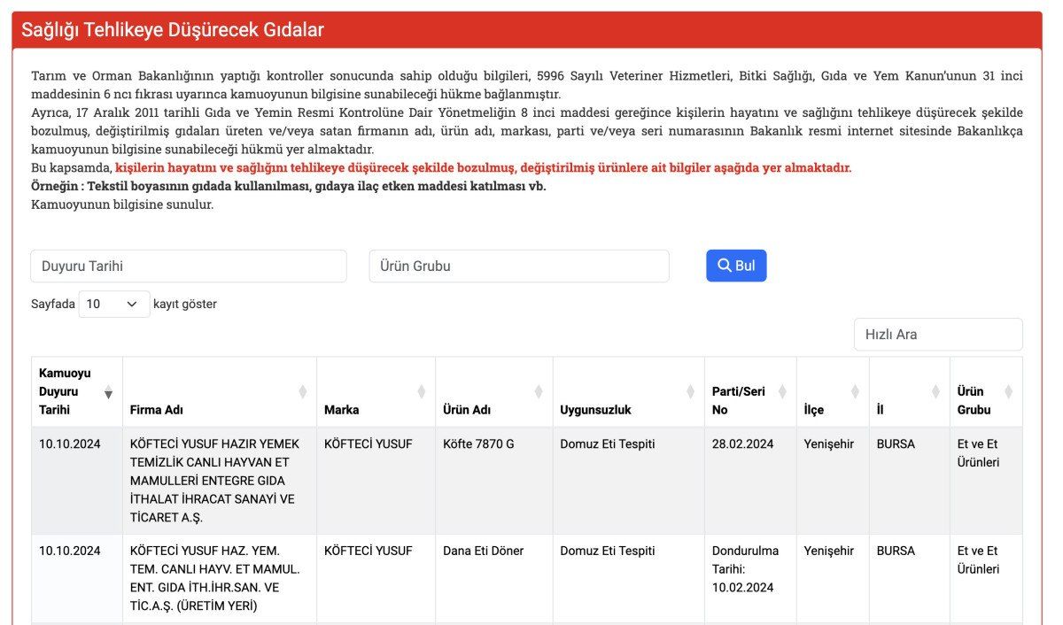 Bakanlığın İnternet sitesinden yapılan yapılan duyuruda Köfteci Yusuf’un Bursa Yenişehir ilçesindeki işletmesinde köfte ve dönerde domuz etinin tespit edildiği açıklandı.