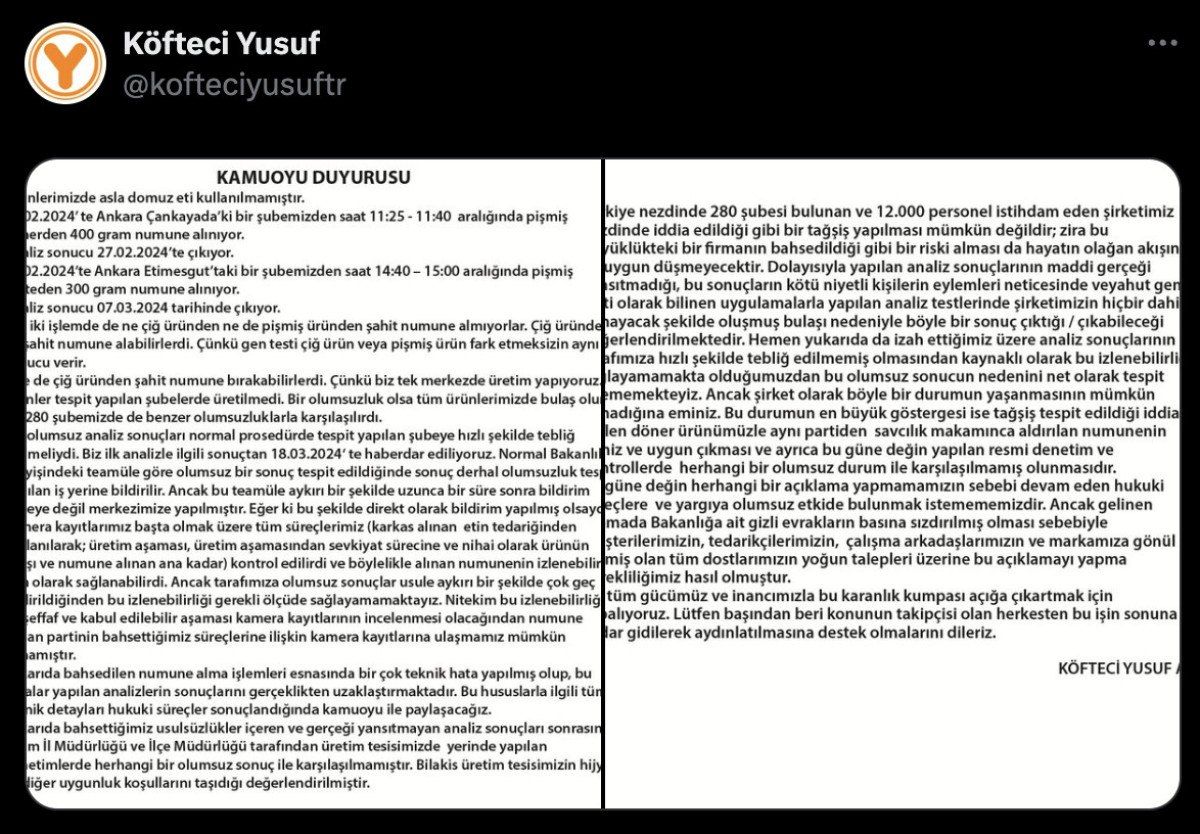 Daha önce domuz eti iddialarını yalanlayan Köfteci Yusuf’tan yapılan açıklamada şu ifadeler kullanılmıştı:
