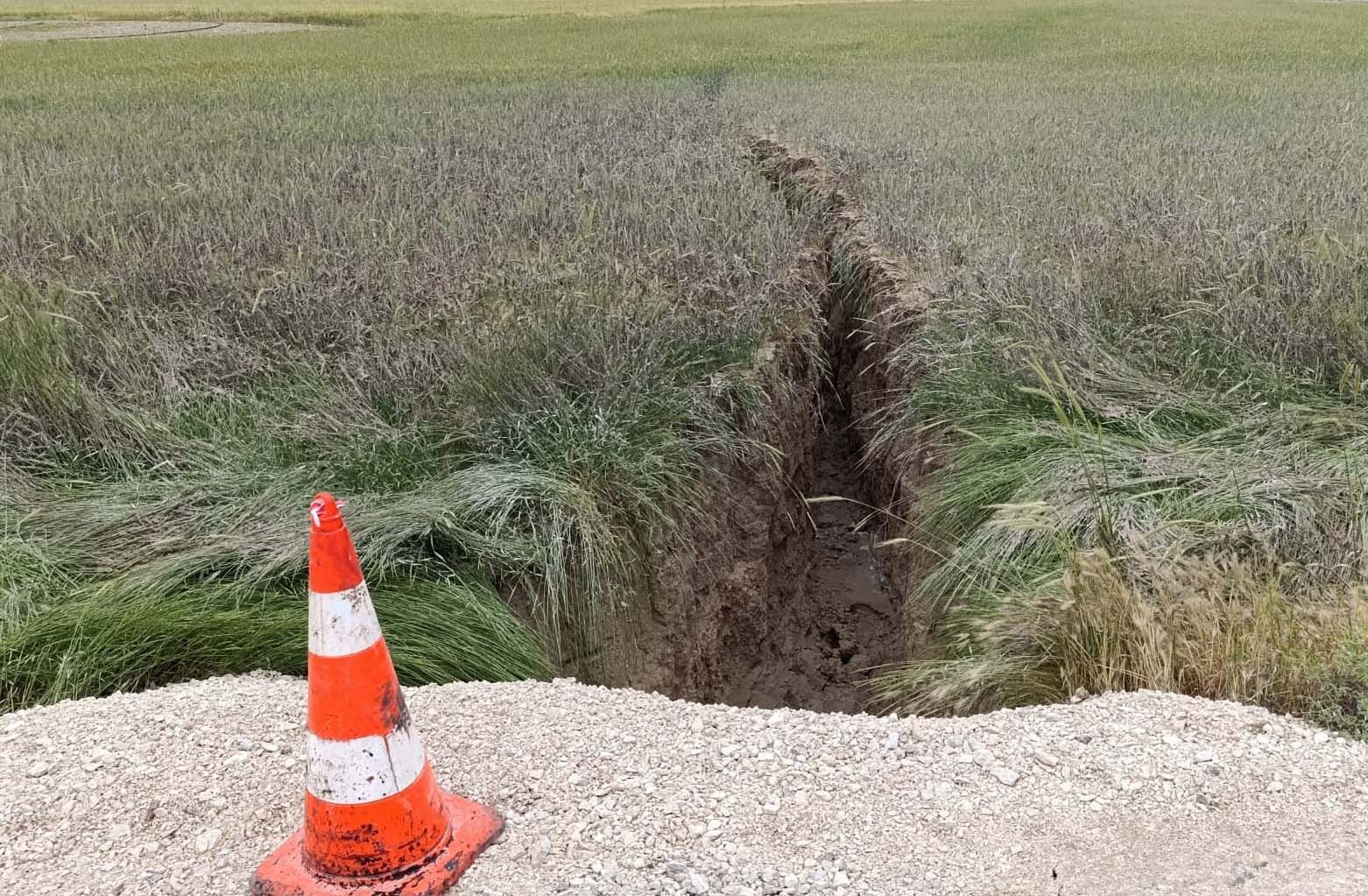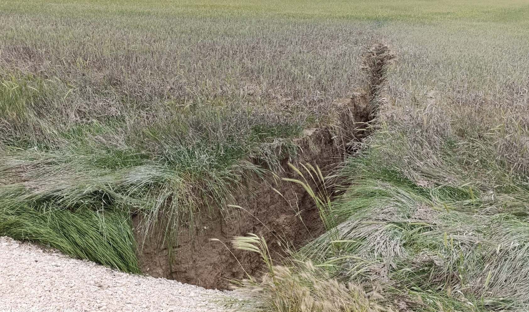 Yoğun yağış sonrası çatlaklıklar büyüyüp, yaklaşık 3-5 metre derinliğinde ve 100 metre uzunluğunda yarık oluştu. Yarık, buğday tarlasından başlayıp, yolun altından, pancar tarlasında ilerliyor. Bu durumu fark edince belediye ekiplerine haber verdik. Ekipler, yolun tadilatını yaptı. Tarlamız da bu hale dönüştü.’‘ şeklinde konuştu.