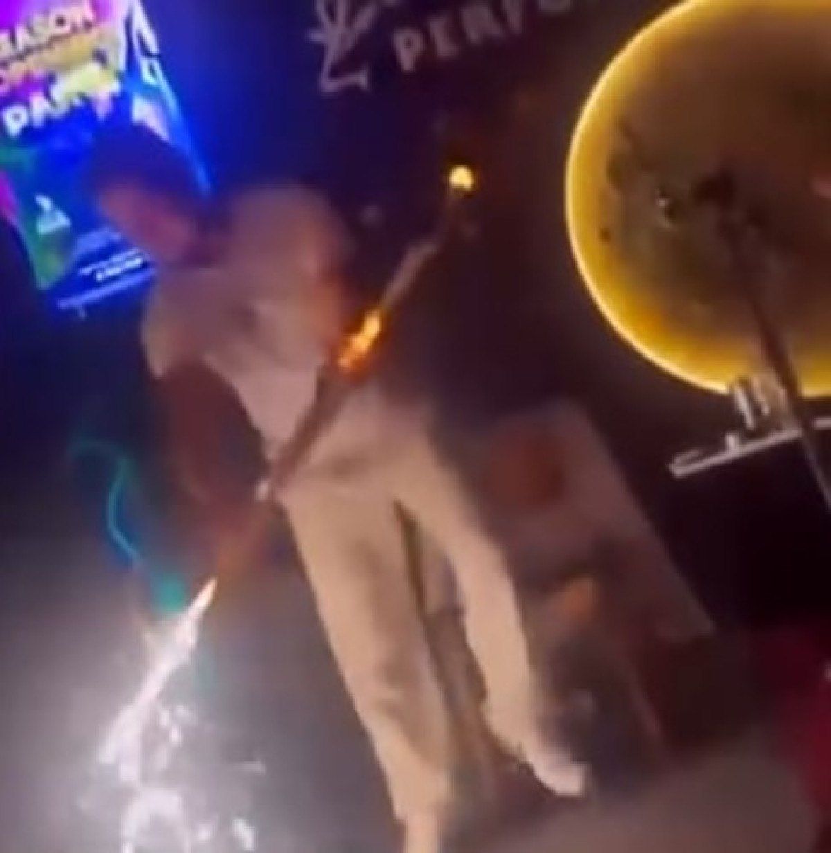 Görüntülerde, müzisyenin konfetiyi klarnetine koyması ve bir anda alev alması, konfetiyi çıkarması ve yardım etmeye çalışanlar yer alıyor.